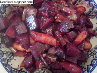 Tonight we had dinner with Baci and I made roasted root vegetables. Baci stated that she doesn't like beets, but she'd try them. Despite her hesitation, she actually liked the sweetness and thought I added sugar or honey, but I didn't. Just a few simple ingredients, which are listed below, make a healthy and pretty side dish. You could use other root vegetables and spices, but my Dad and I have been zen cooking here and we used what we had in the fridge and pantry.